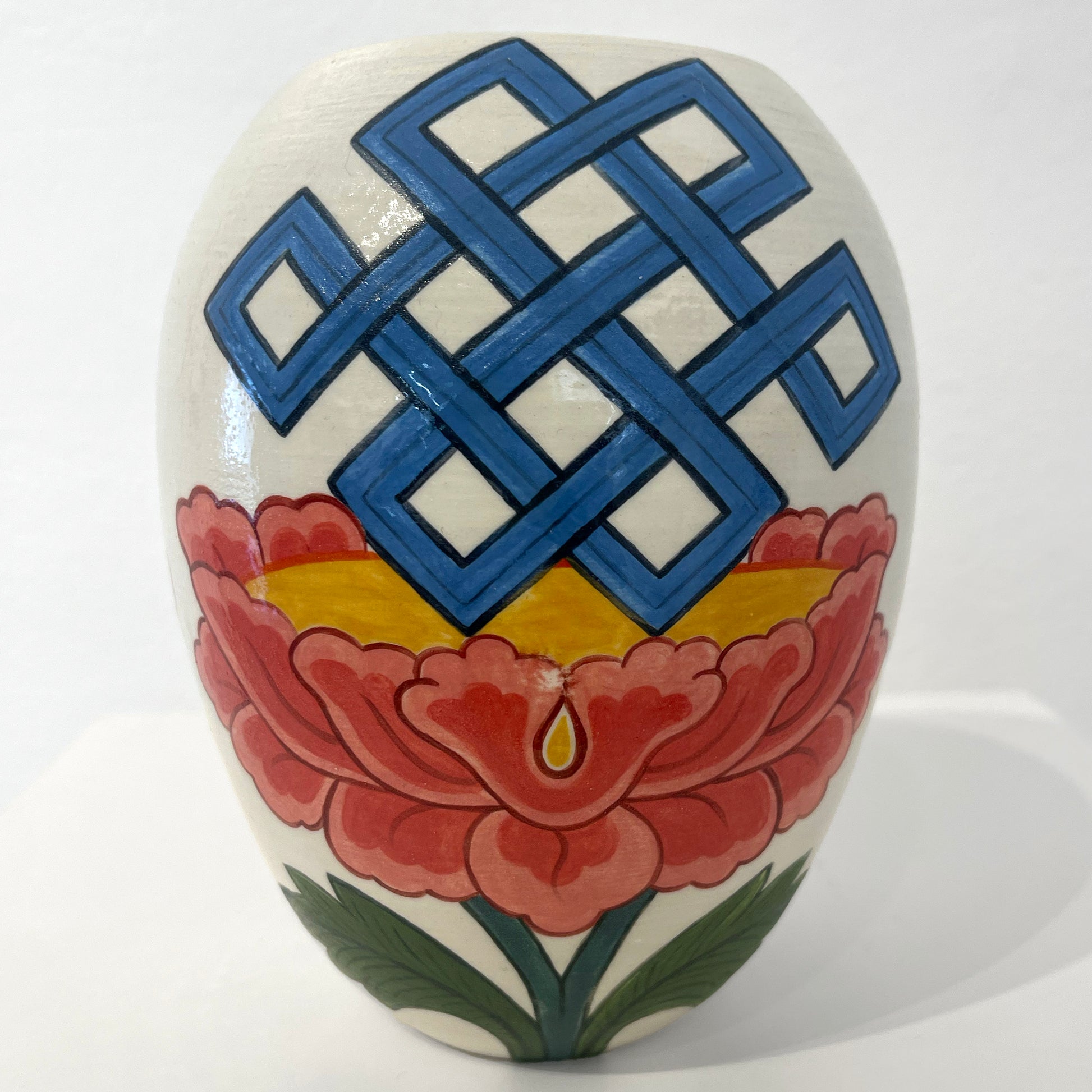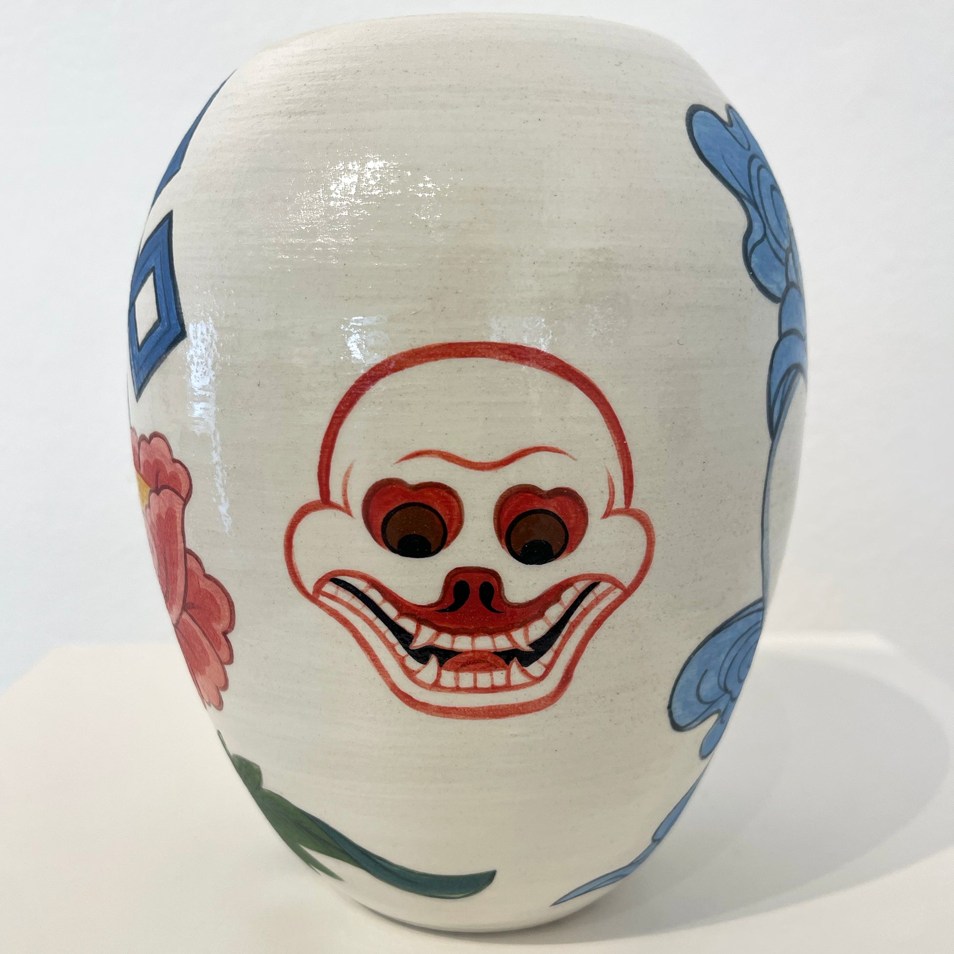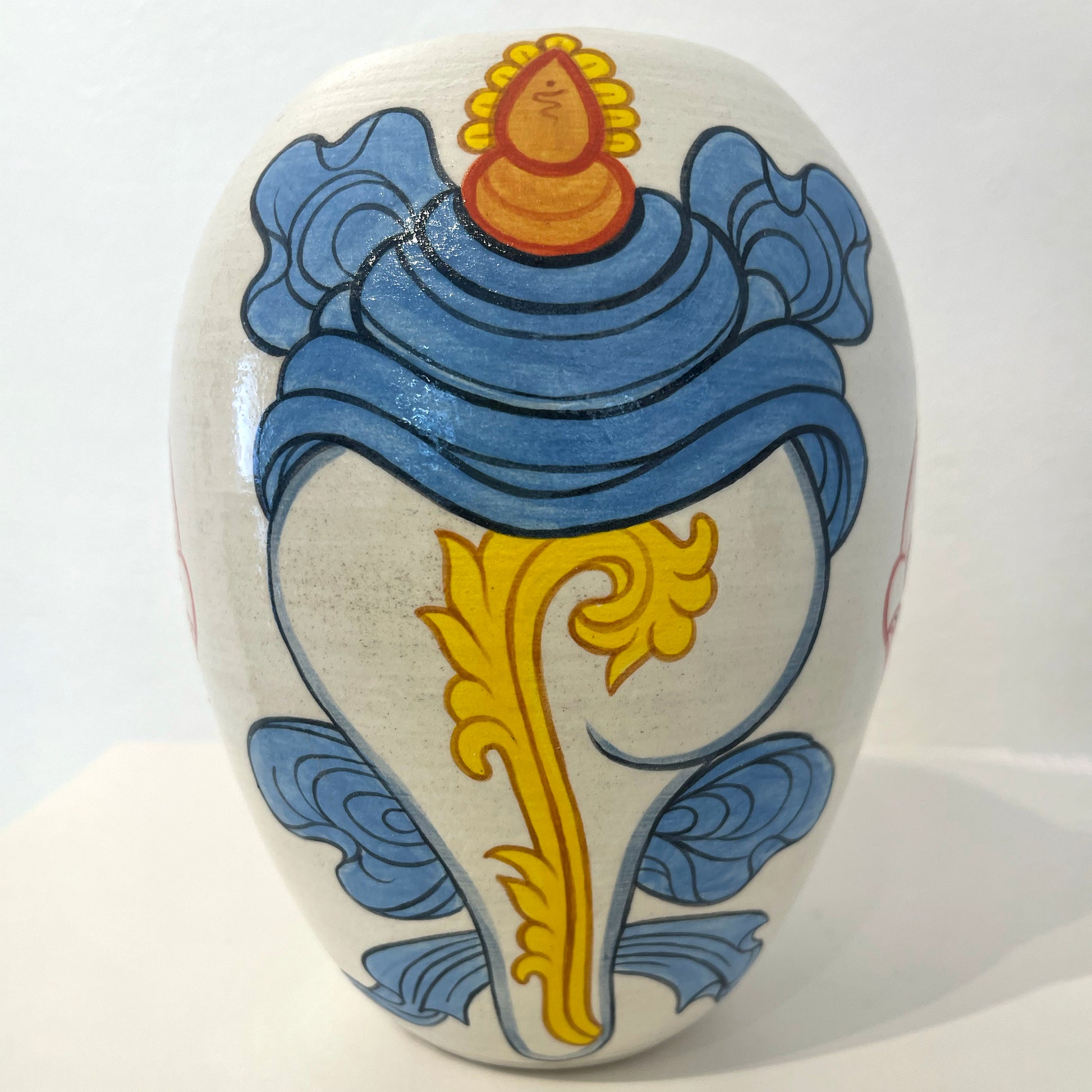 Flo Nuttall, whose ceramics are known by the alias Divineartpottery, is originally from the United Kingdom, but currently based in Rome, Italy, where she has lived for the past 10 years. Her ceramic work is inspired by years of tattooing and traveling through various parts of Asia, where she deepened her interest in eastern imagery; the subjects, the colour palettes, and the mythology. Her most recent work is mainly focused around Tibetan and Buddhist /Hindu imagery, where she enjoys blending together symbols and subjects as one might in tattooing, only this time with the medium of paint. She aims to make pieces that convey not just the beauty, but also the macabre and mystical nature of these fascinating symbolic representations.