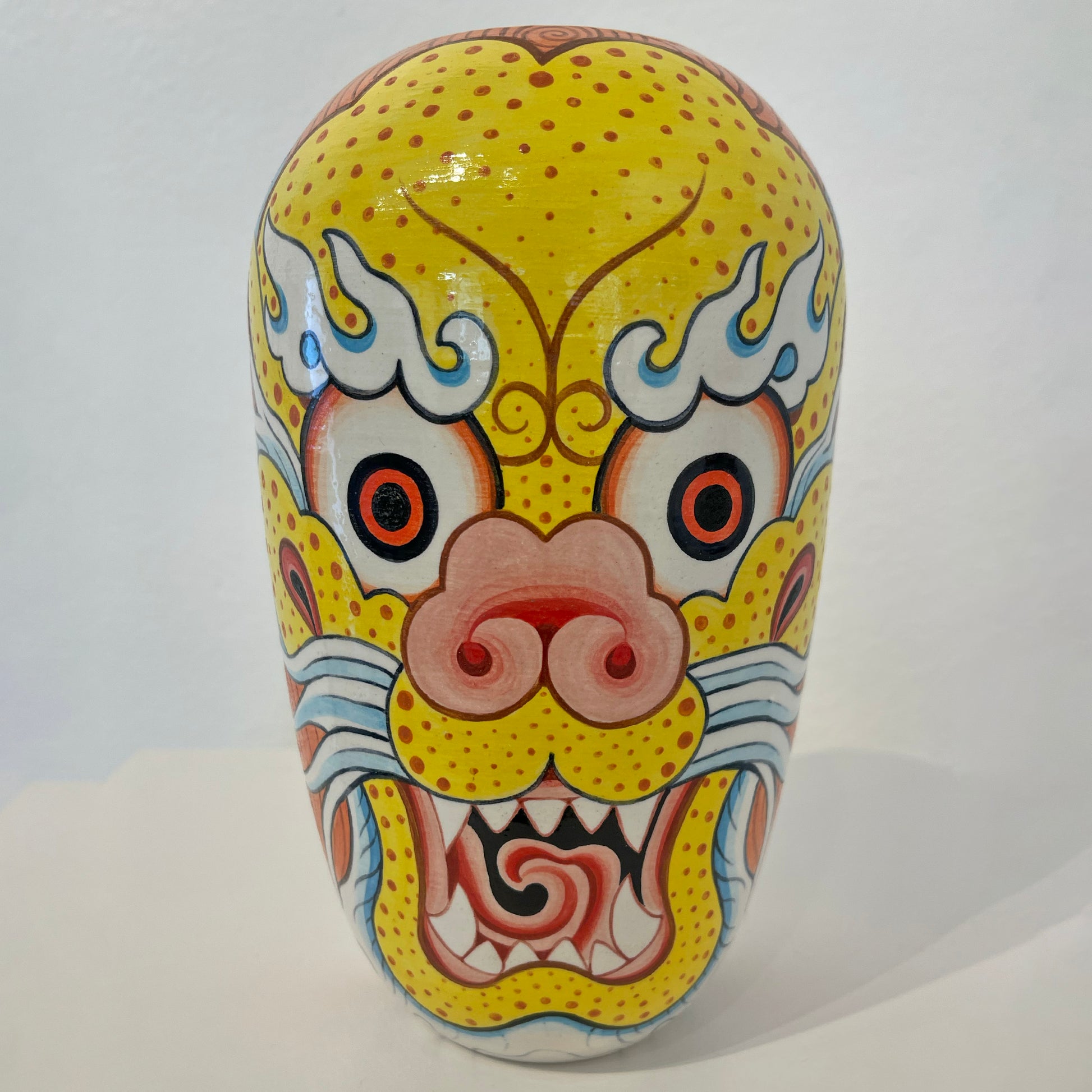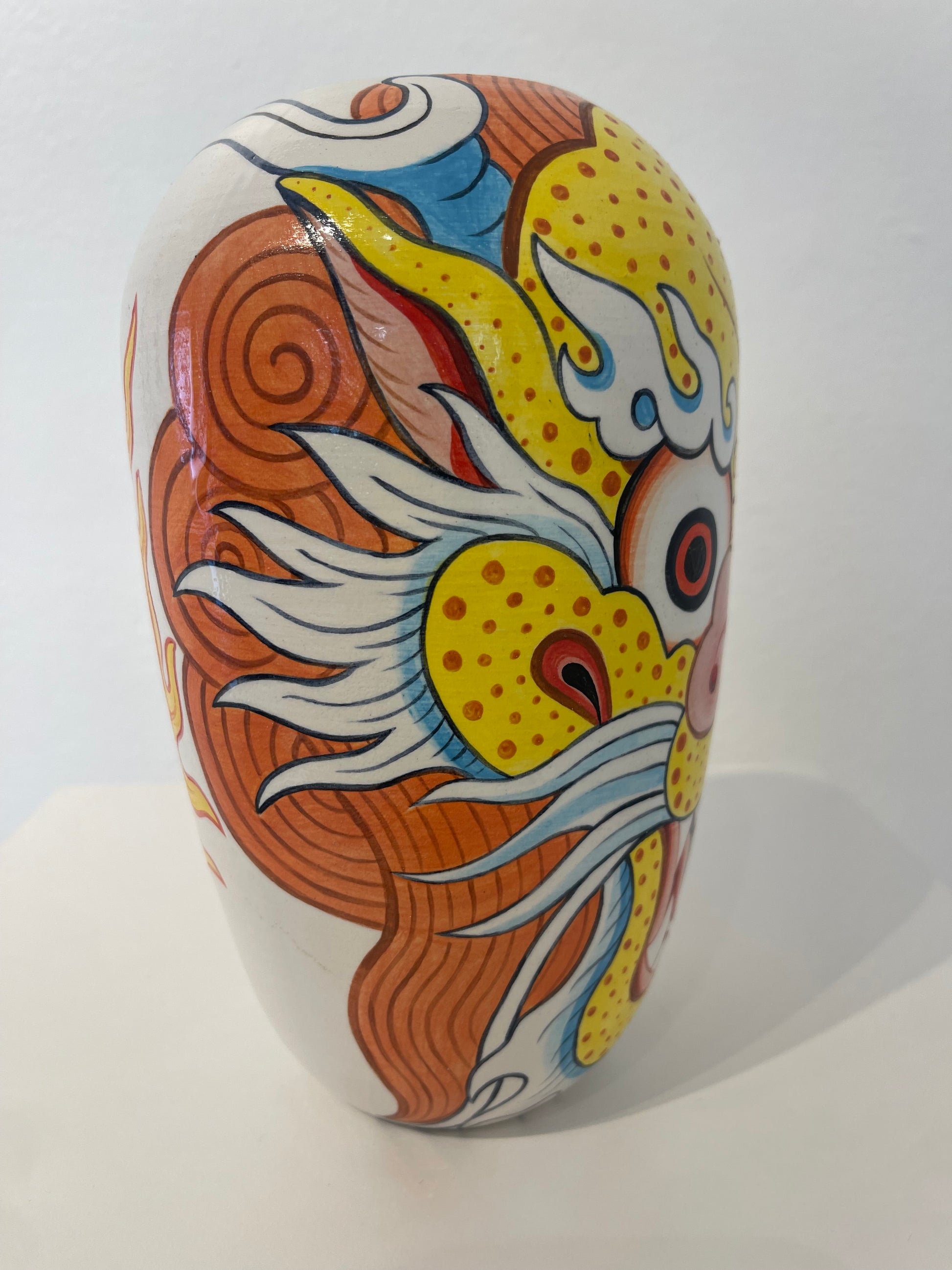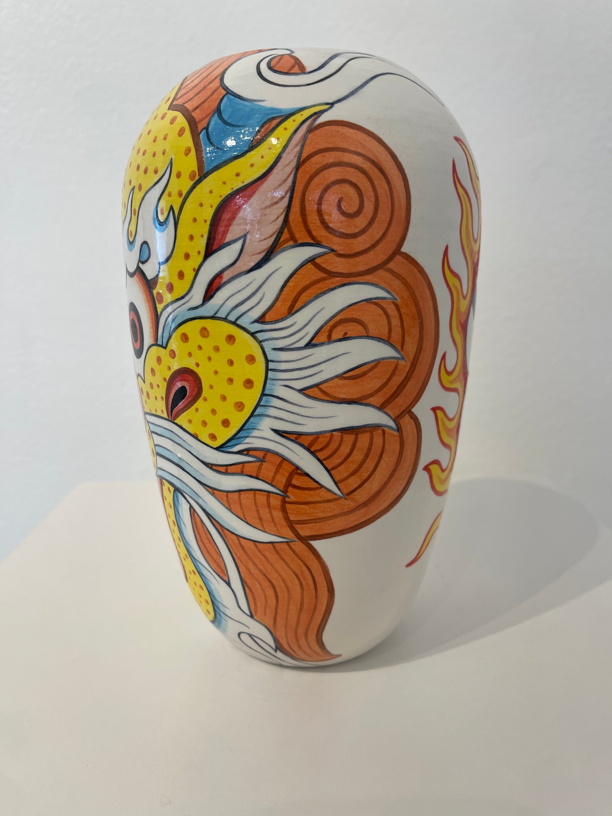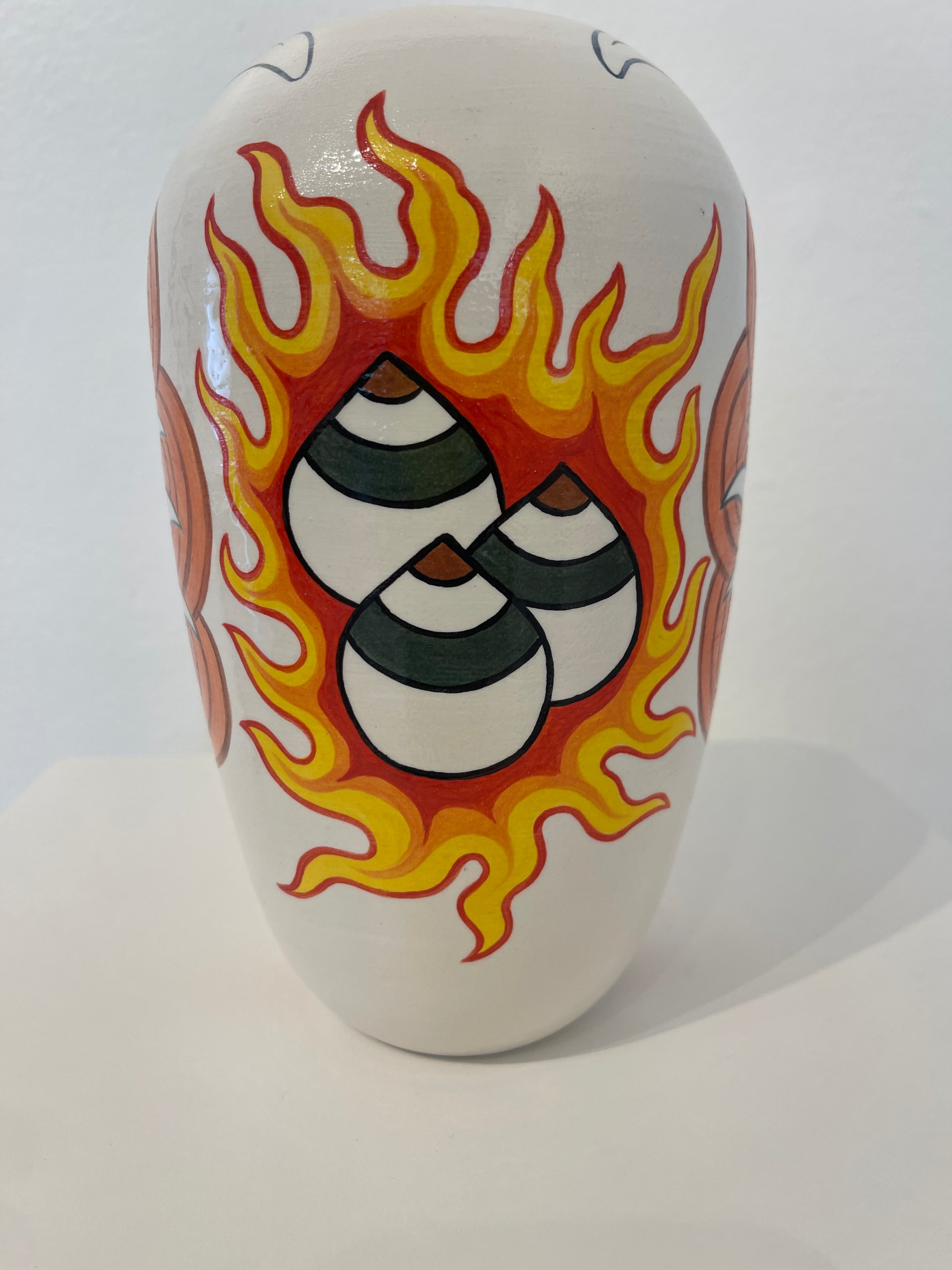 Flo Nuttall, whose ceramics are known by the alias Divineartpottery, is originally from the United Kingdom, but currently based in Rome, Italy, where she has lived for the past 10 years. Her ceramic work is inspired by years of tattooing and traveling through various parts of Asia, where she deepened her interest in eastern imagery; the subjects, the colour palettes, and the mythology. Her most recent work is mainly focused around Tibetan and Buddhist /Hindu imagery, where she enjoys blending together symbols and subjects as one might in tattooing, only this time with the medium of paint. She aims to make pieces that convey not just the beauty, but also the macabre and mystical nature of these fascinating symbolic representations.
