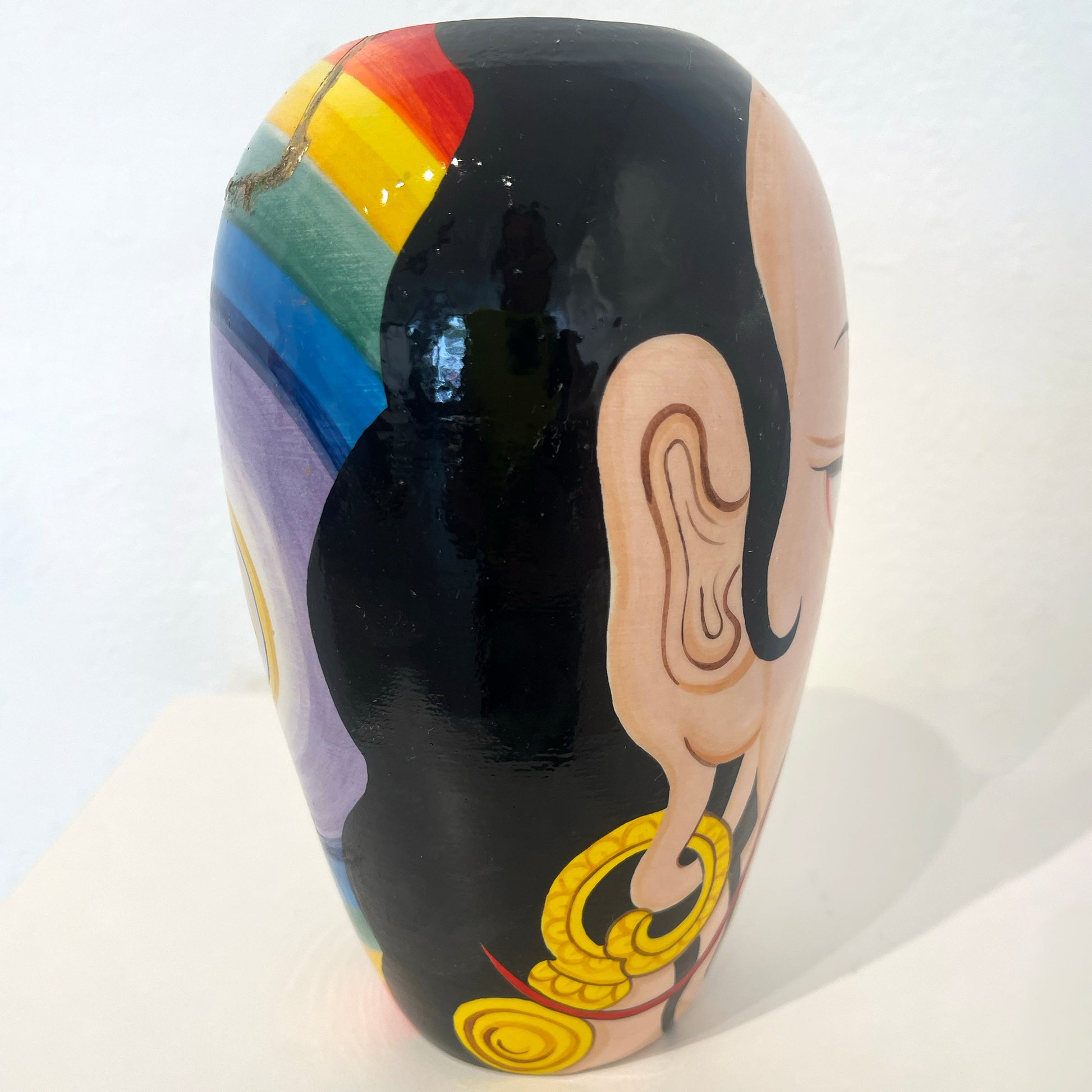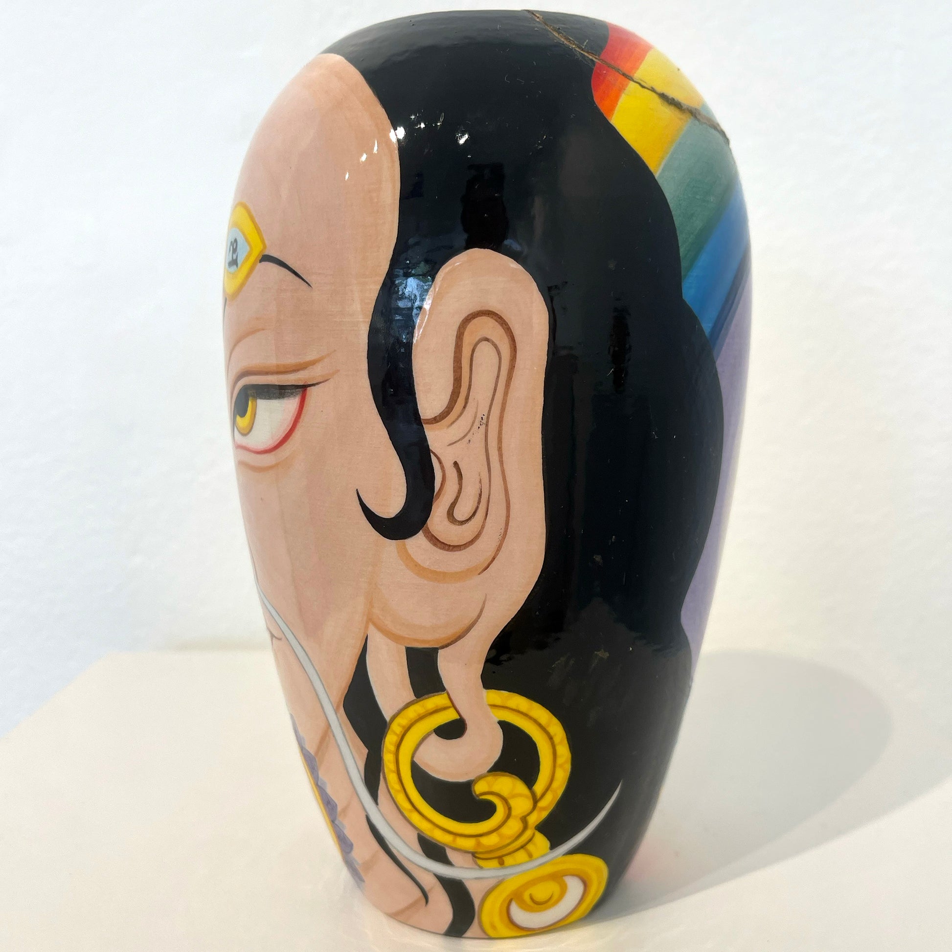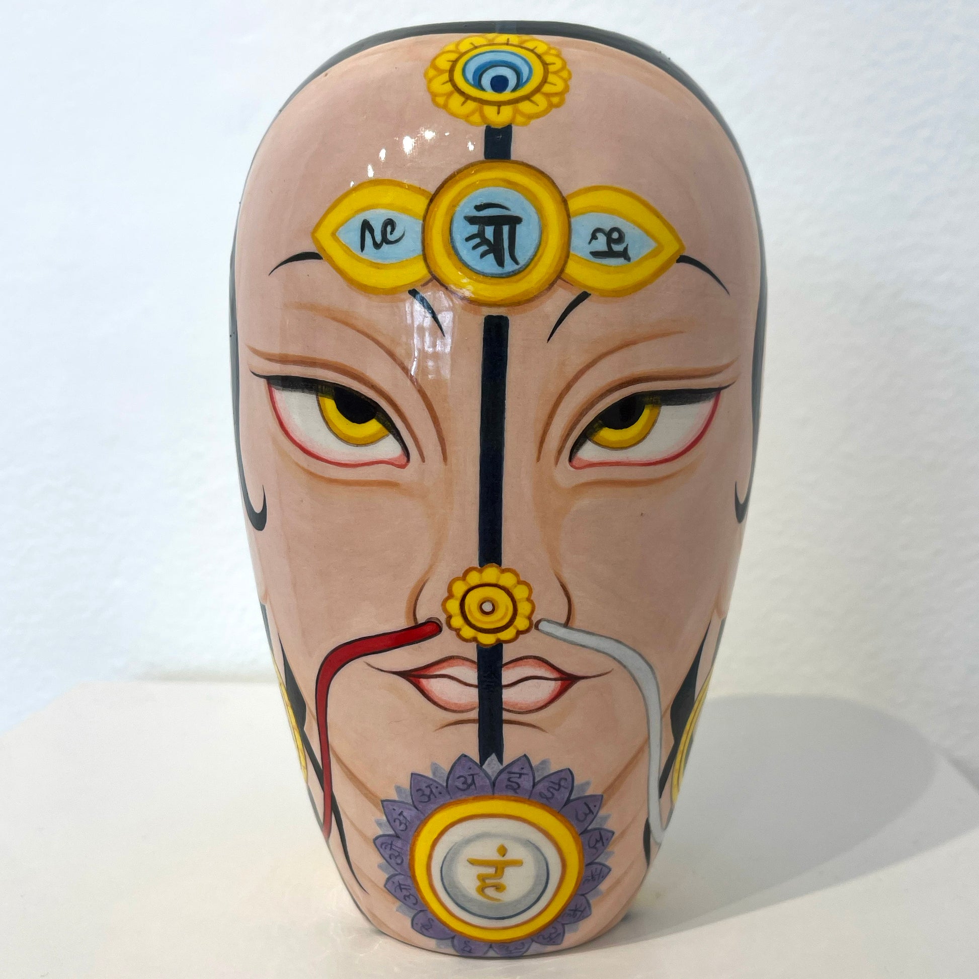 Flo Nuttall, whose ceramics are known by the alias Divineartpottery, is originally from the United Kingdom, but currently based in Rome, Italy, where she has lived for the past 10 years. Her ceramic work is inspired by years of tattooing and traveling through various parts of Asia, where she deepened her interest in eastern imagery; the subjects, the colour palettes, and the mythology. Her most recent work is mainly focused around Tibetan and Buddhist /Hindu imagery, where she enjoys blending together symbols and subjects as one might in tattooing, only this time with the medium of paint. She aims to make pieces that convey not just the beauty, but also the macabre and mystical nature of these fascinating symbolic representations.