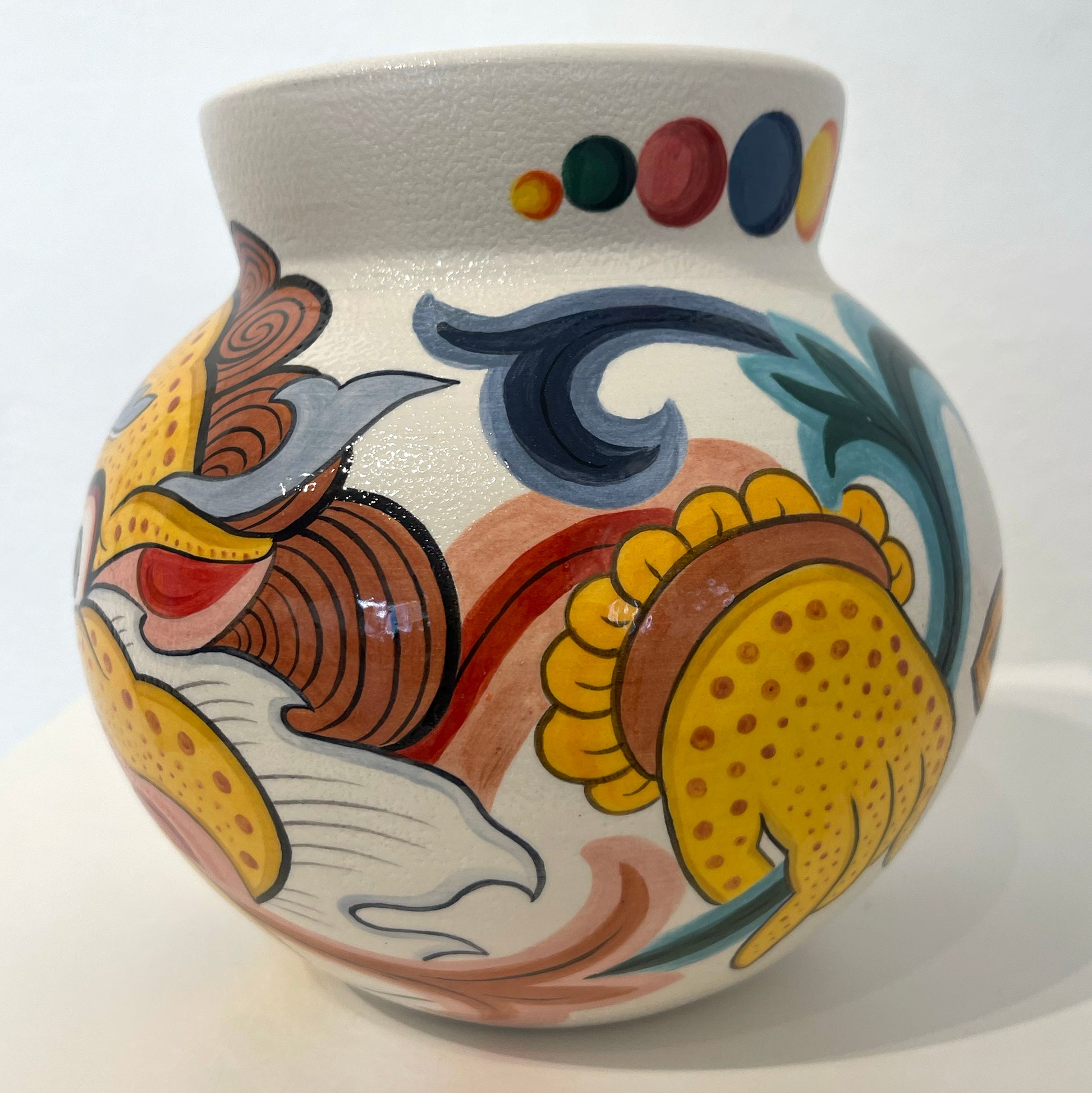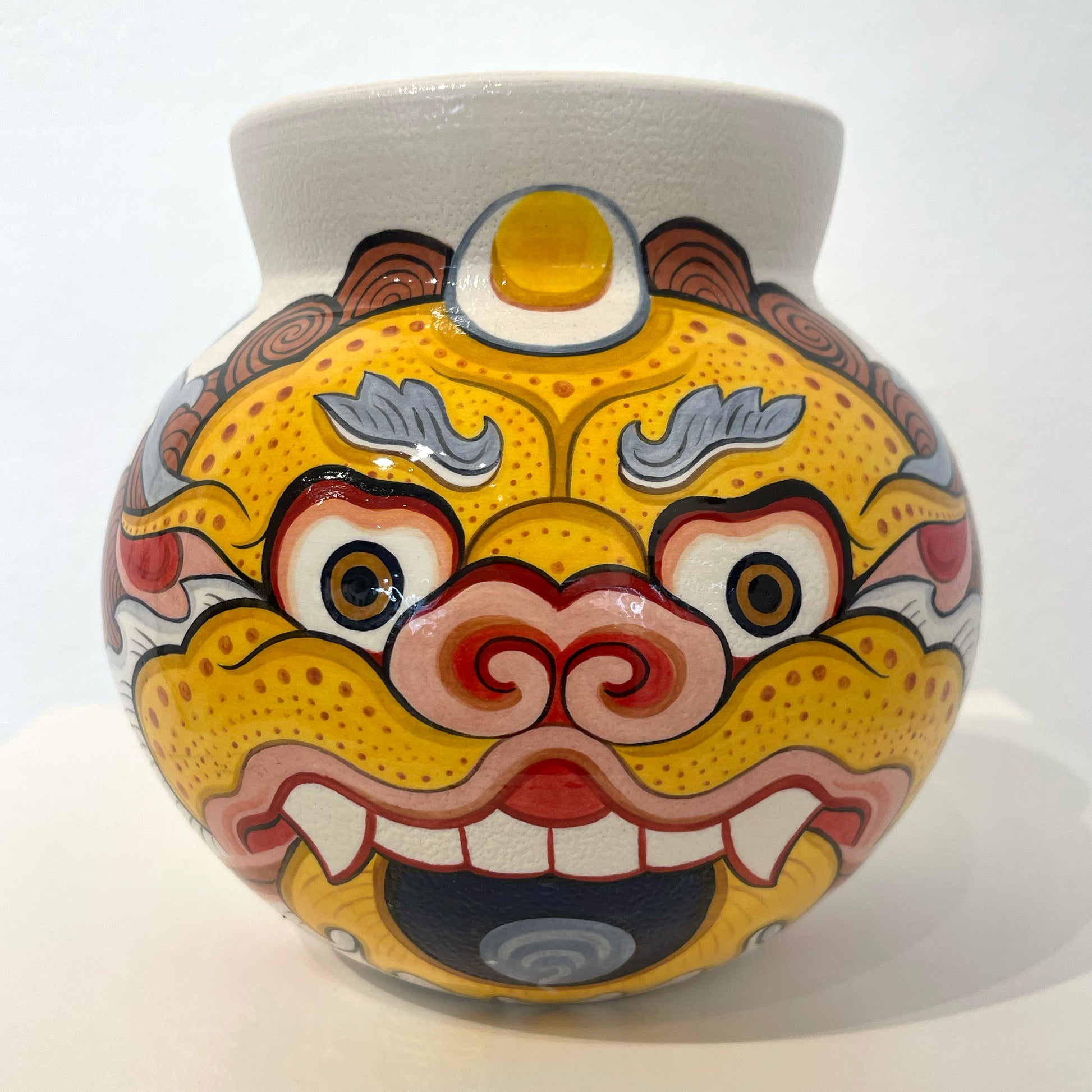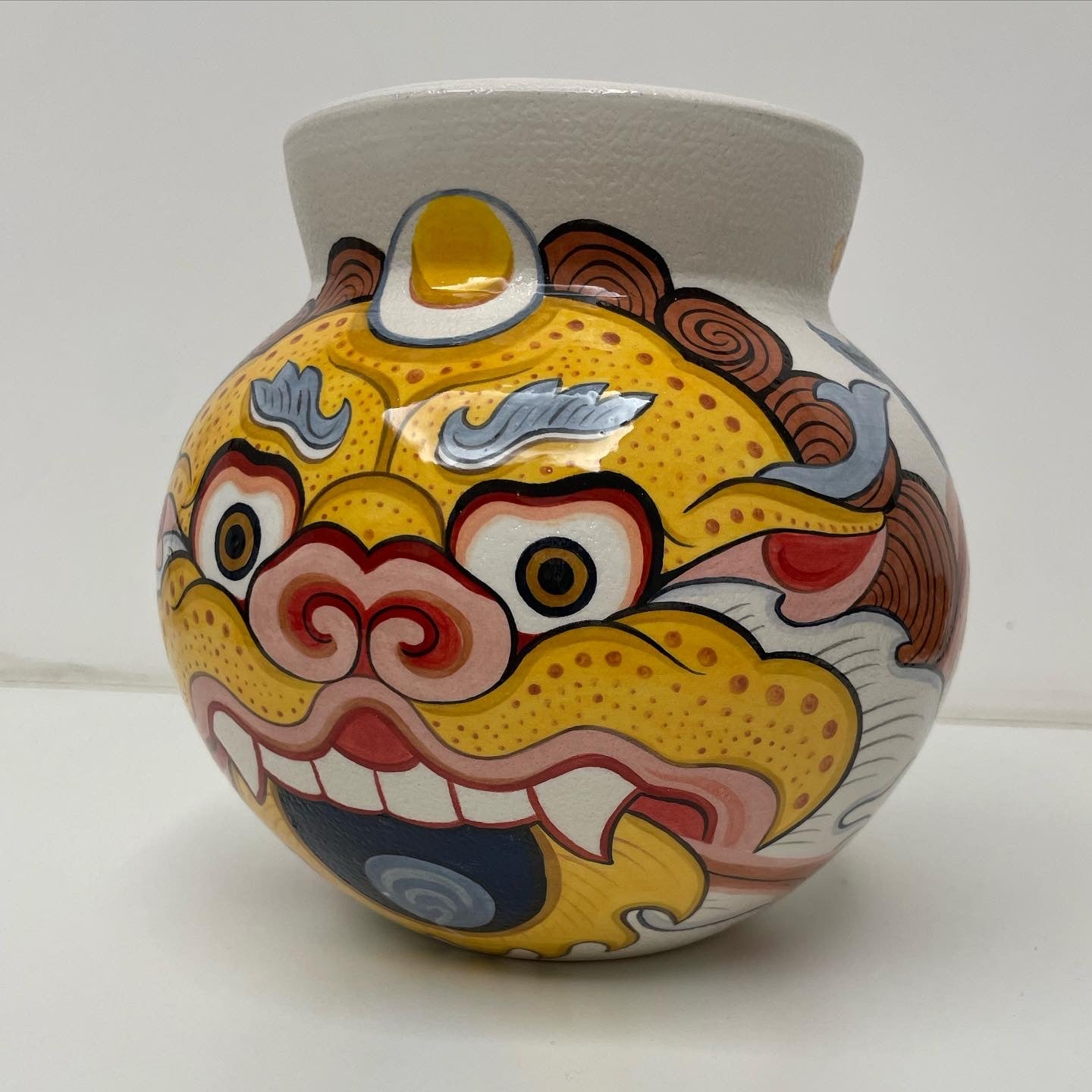 Flo Nuttall, whose ceramics are known by the alias Divineartpottery, is originally from the United Kingdom, but currently based in Rome, Italy, where she has lived for the past 10 years. Her ceramic work is inspired by years of tattooing and traveling through various parts of Asia, where she deepened her interest in eastern imagery; the subjects, the colour palettes, and the mythology. Her most recent work is mainly focused around Tibetan and Buddhist /Hindu imagery, where she enjoys blending together symbols and subjects as one might in tattooing, only this time with the medium of paint. She aims to make pieces that convey not just the beauty, but also the macabre and mystical nature of these fascinating symbolic representations.