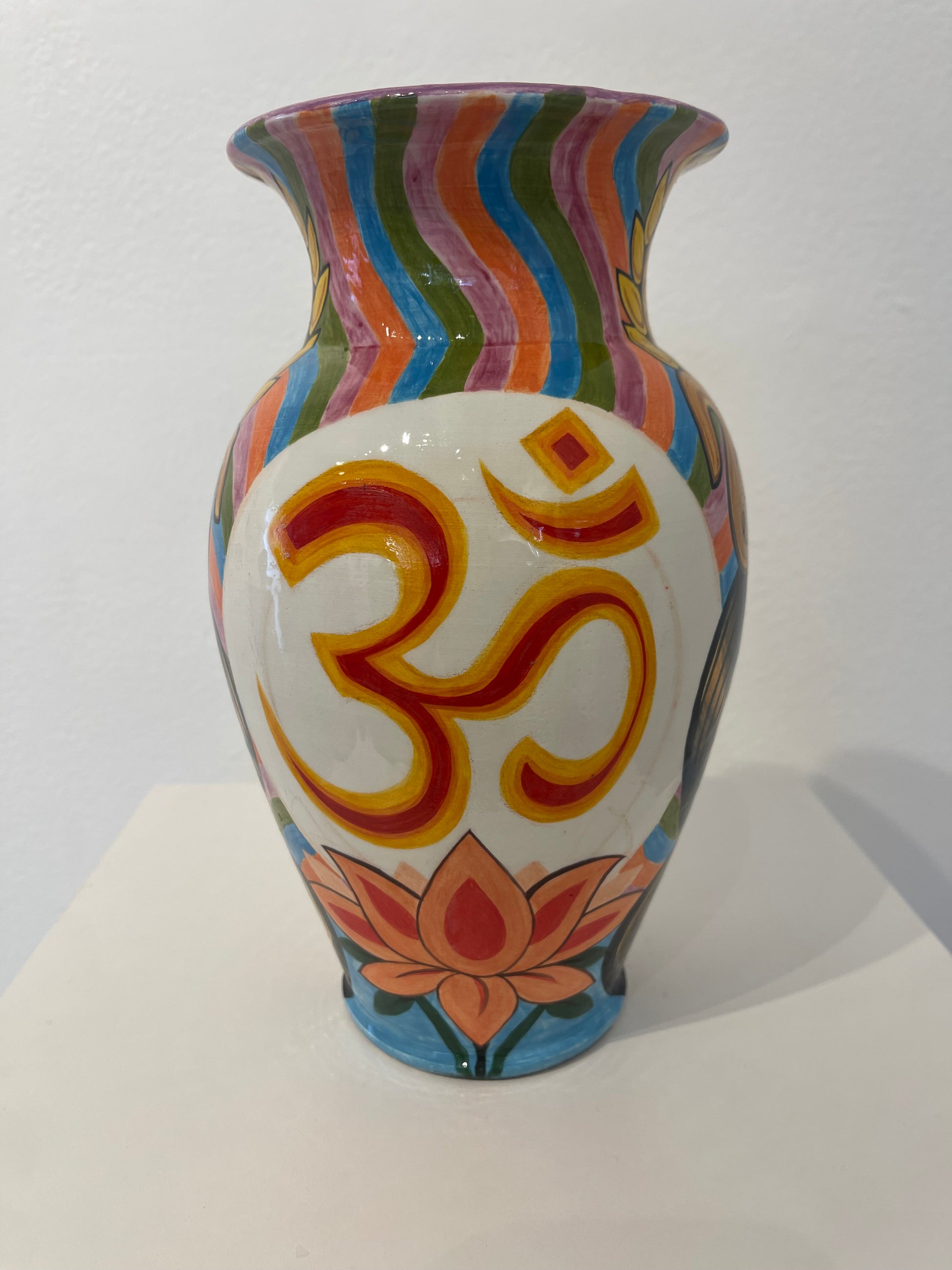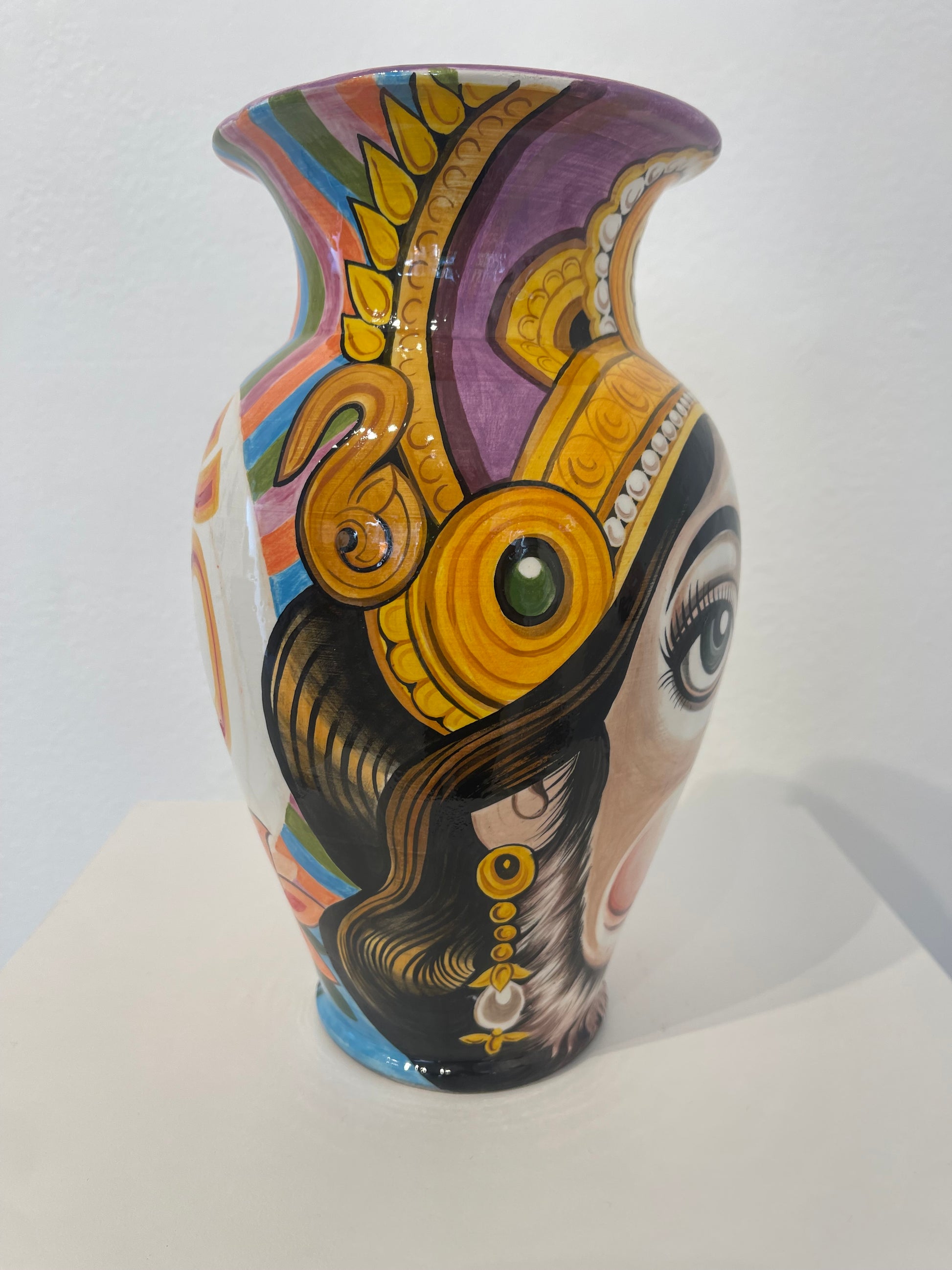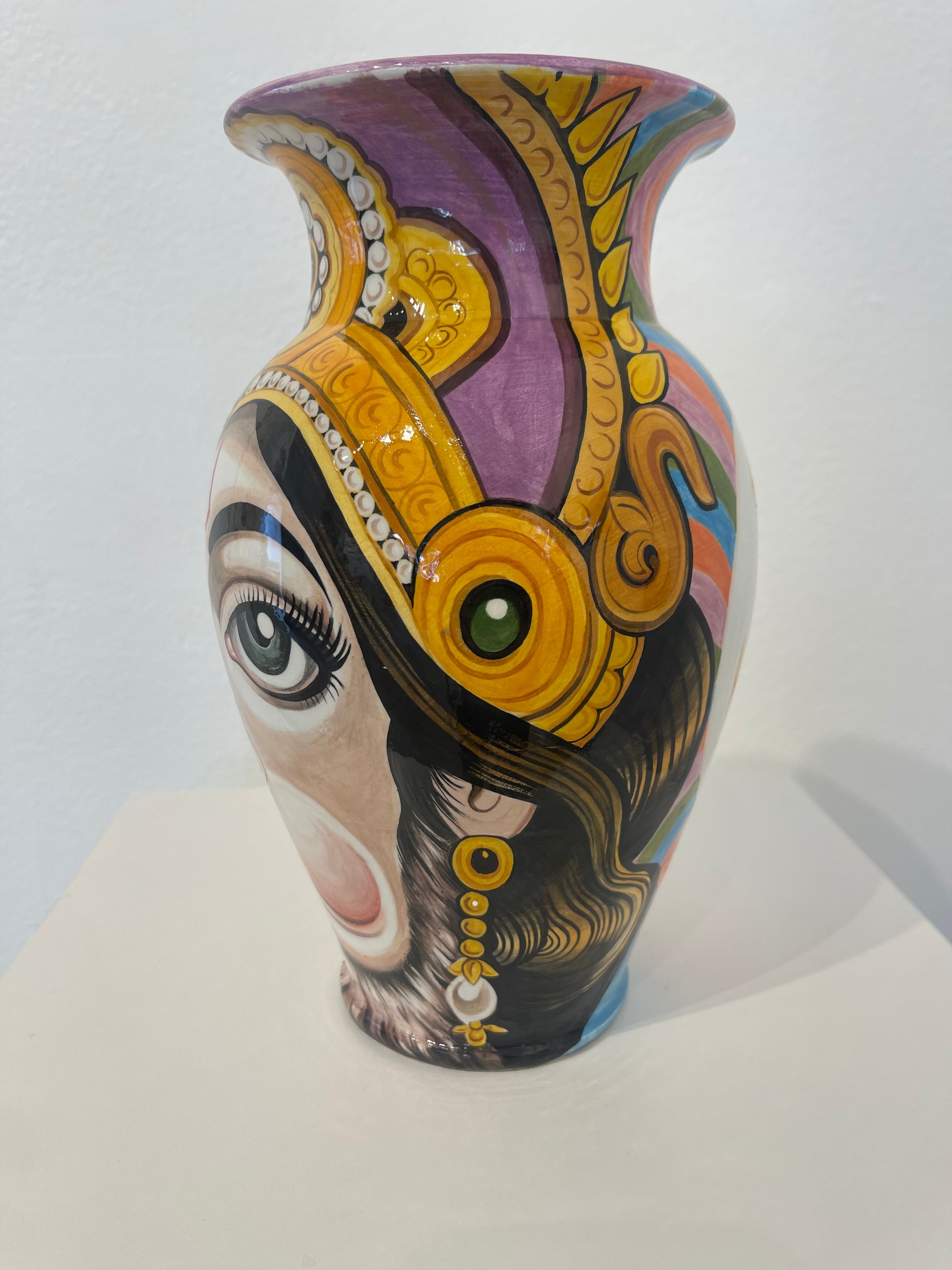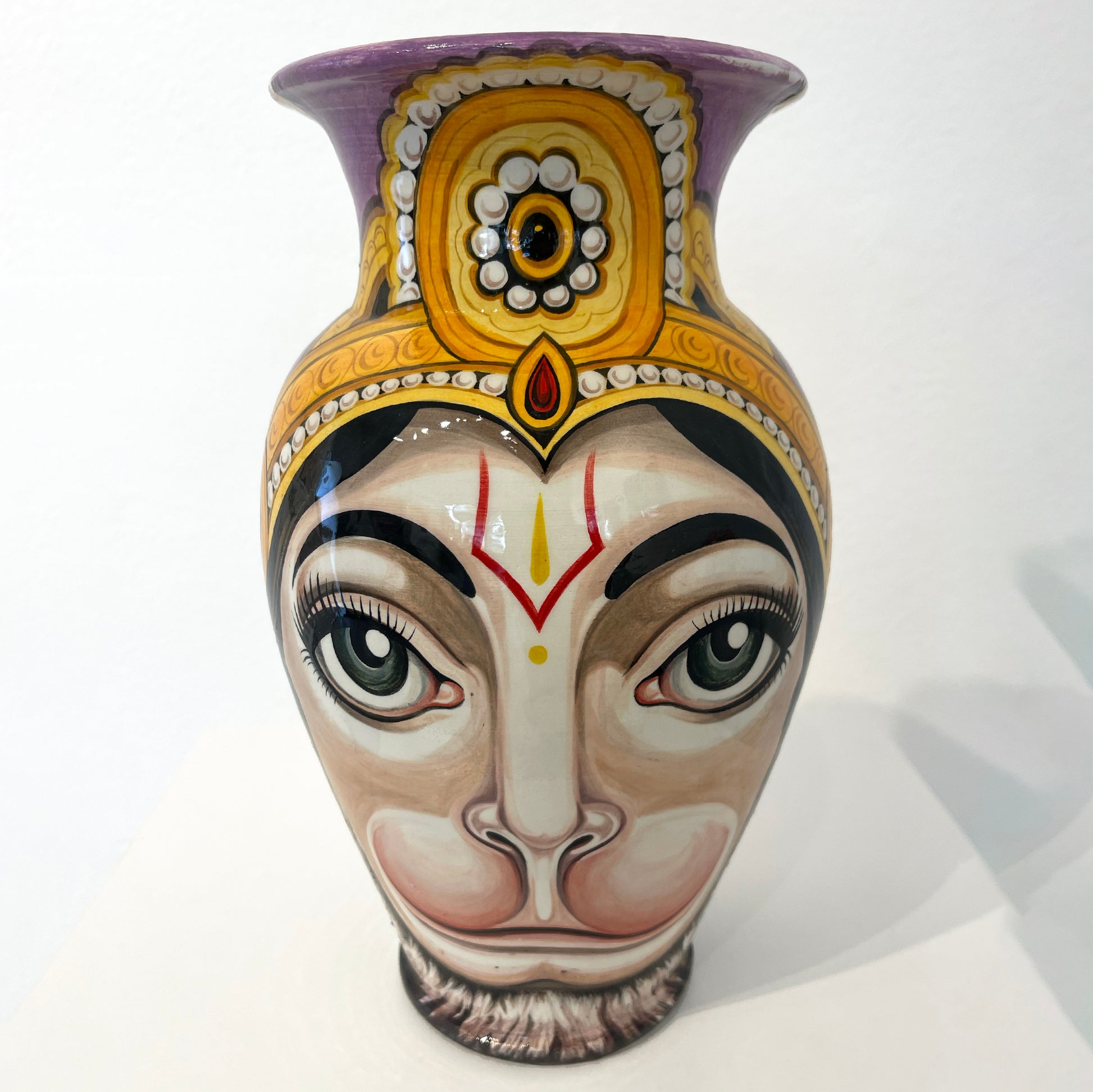 Flo Nuttall, whose ceramics are known by the alias Divineartpottery, is originally from the United Kingdom, but currently based in Rome, Italy, where she has lived for the past 10 years. Her ceramic work is inspired by years of tattooing and traveling through various parts of Asia, where she deepened her interest in eastern imagery; the subjects, the colour palettes, and the mythology. Her most recent work is mainly focused around Tibetan and Buddhist /Hindu imagery, where she enjoys blending together symbols and subjects as one might in tattooing, only this time with the medium of paint. She aims to make pieces that convey not just the beauty, but also the macabre and mystical nature of these fascinating symbolic representations.