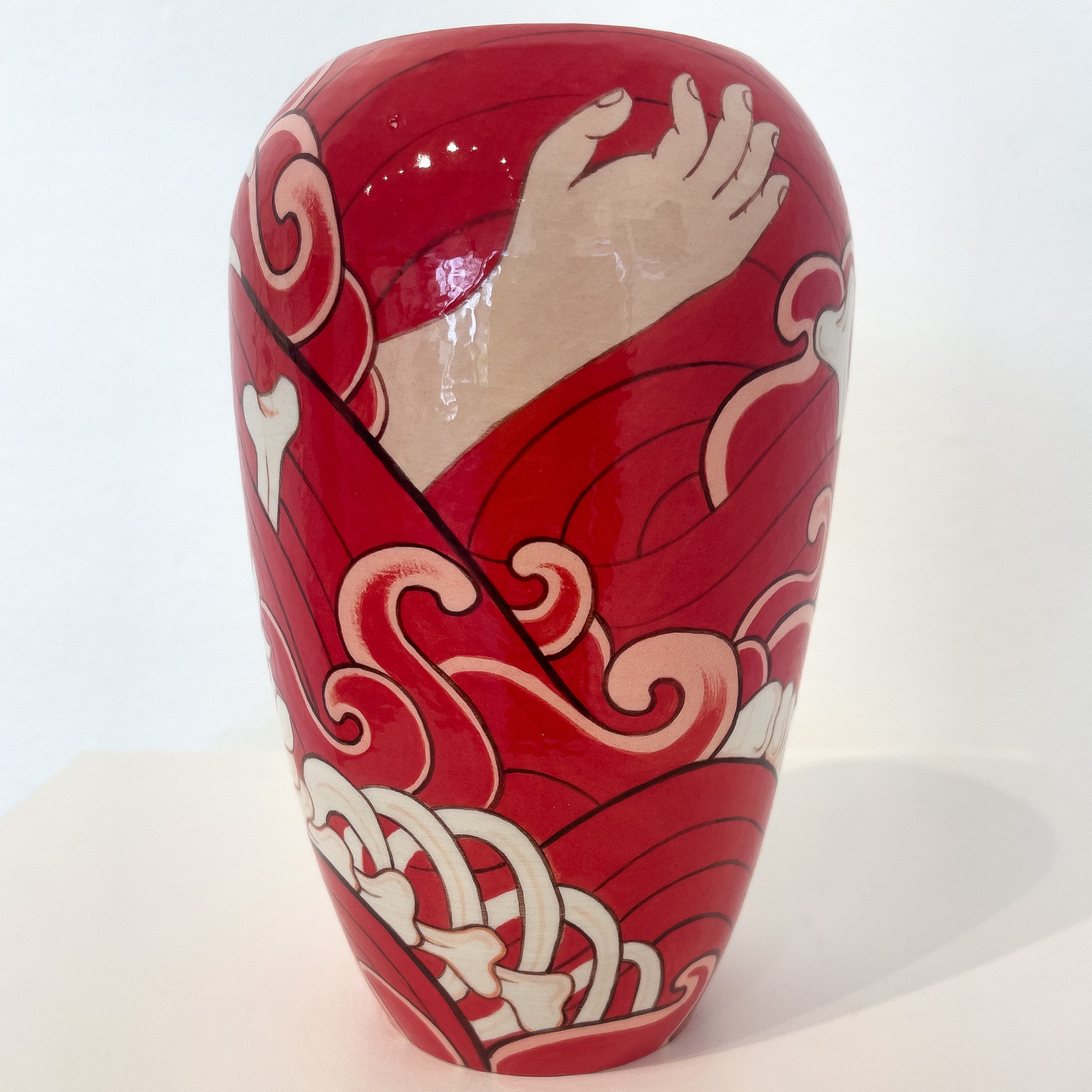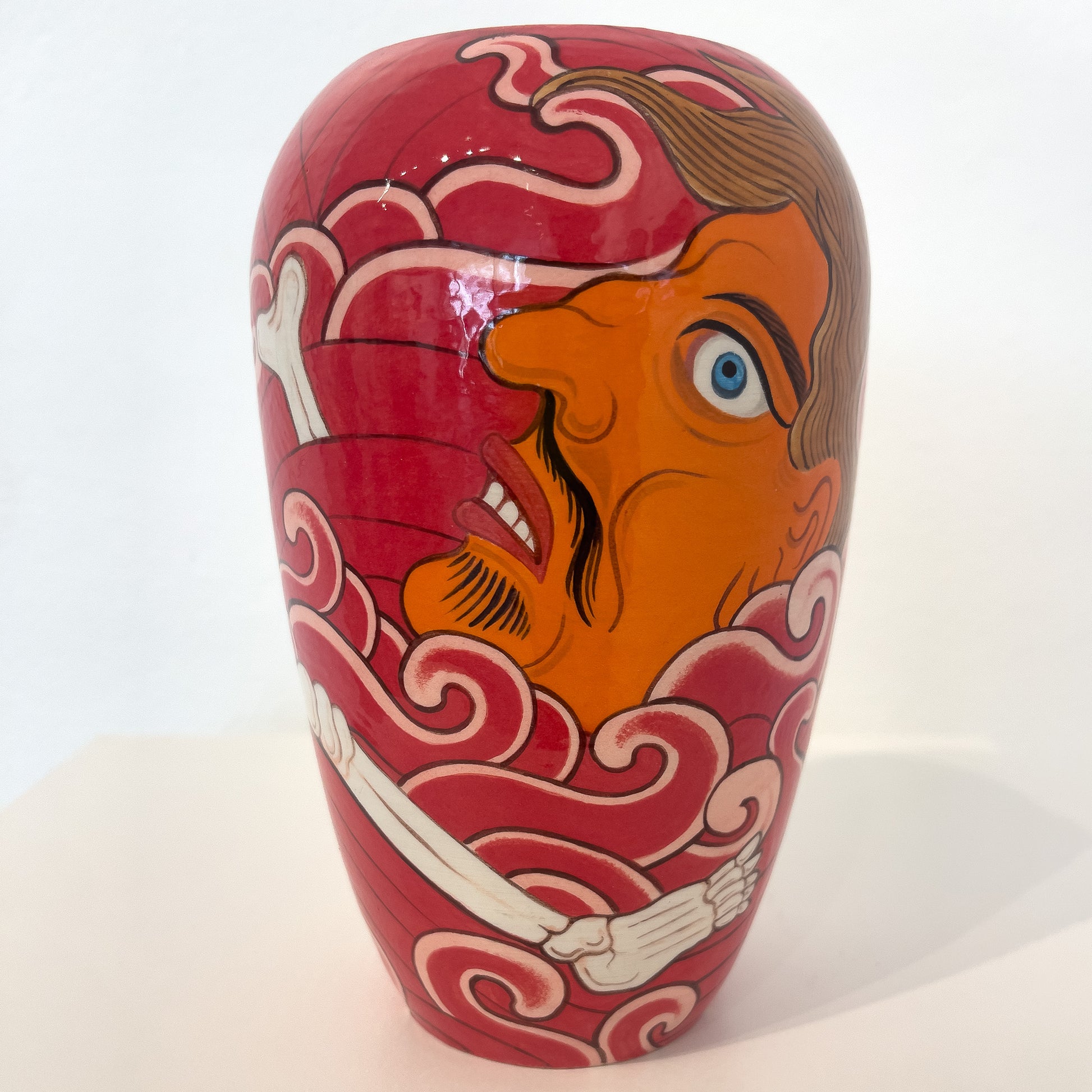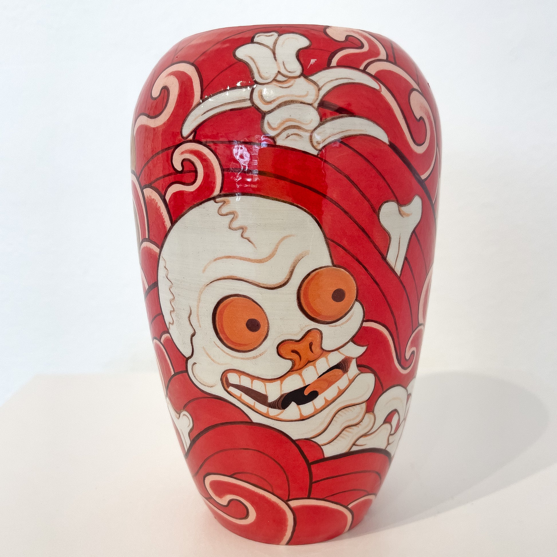 Flo Nuttall, whose ceramics are known by the alias Divineartpottery, is originally from the United Kingdom, but currently based in Rome, Italy, where she has lived for the past 10 years. Her ceramic work is inspired by years of tattooing and traveling through various parts of Asia, where she deepened her interest in eastern imagery; the subjects, the colour palettes, and the mythology. Her most recent work is mainly focused around Tibetan and Buddhist /Hindu imagery, where she enjoys blending together symbols and subjects as one might in tattooing, only this time with the medium of paint. She aims to make pieces that convey not just the beauty, but also the macabre and mystical nature of these fascinating symbolic representations.