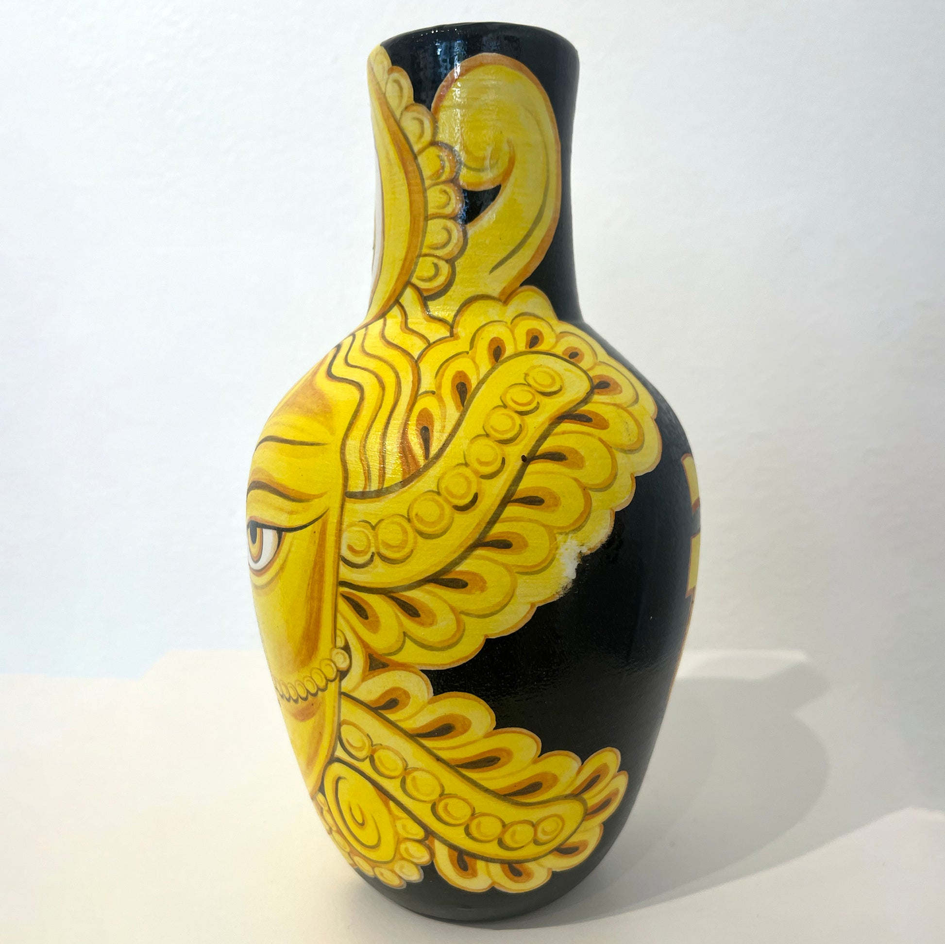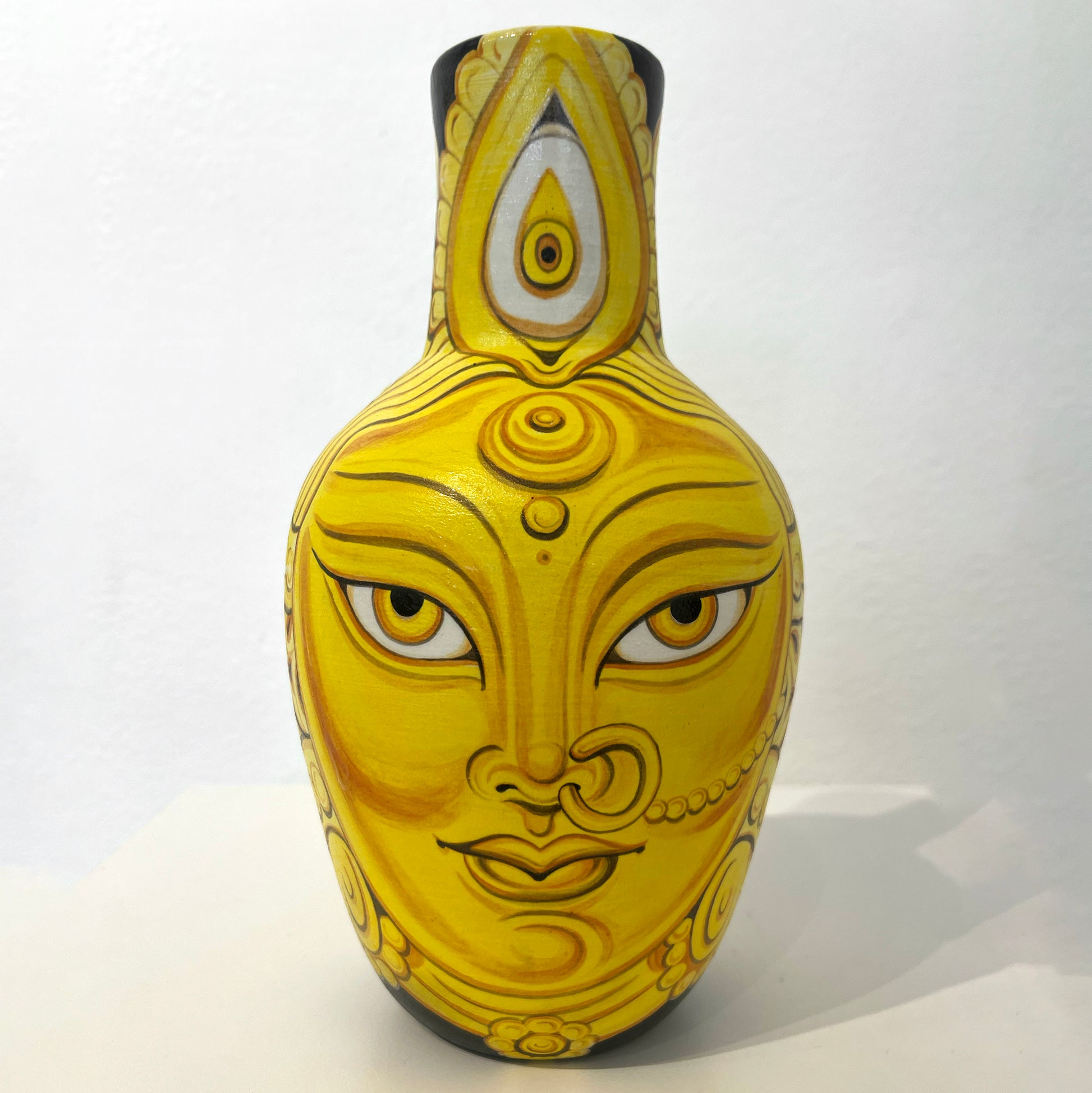 Flo Nuttall, whose ceramics are known by the alias Divineartpottery, is originally from the United Kingdom, but currently based in Rome, Italy, where she has lived for the past 10 years. Her ceramic work is inspired by years of tattooing and traveling through various parts of Asia, where she deepened her interest in eastern imagery; the subjects, the colour palettes, and the mythology. Her most recent work is mainly focused around Tibetan and Buddhist /Hindu imagery, where she enjoys blending together symbols and subjects as one might in tattooing, only this time with the medium of paint. She aims to make pieces that convey not just the beauty, but also the macabre and mystical nature of these fascinating symbolic representations.