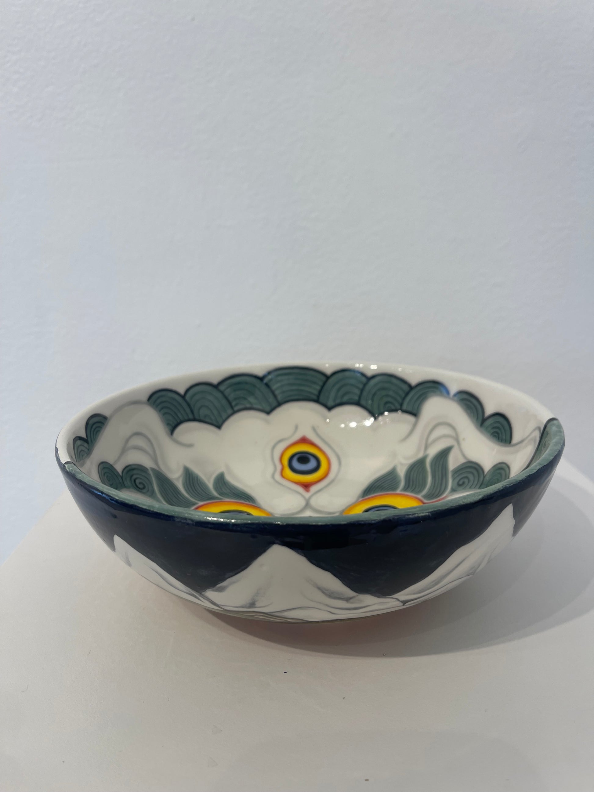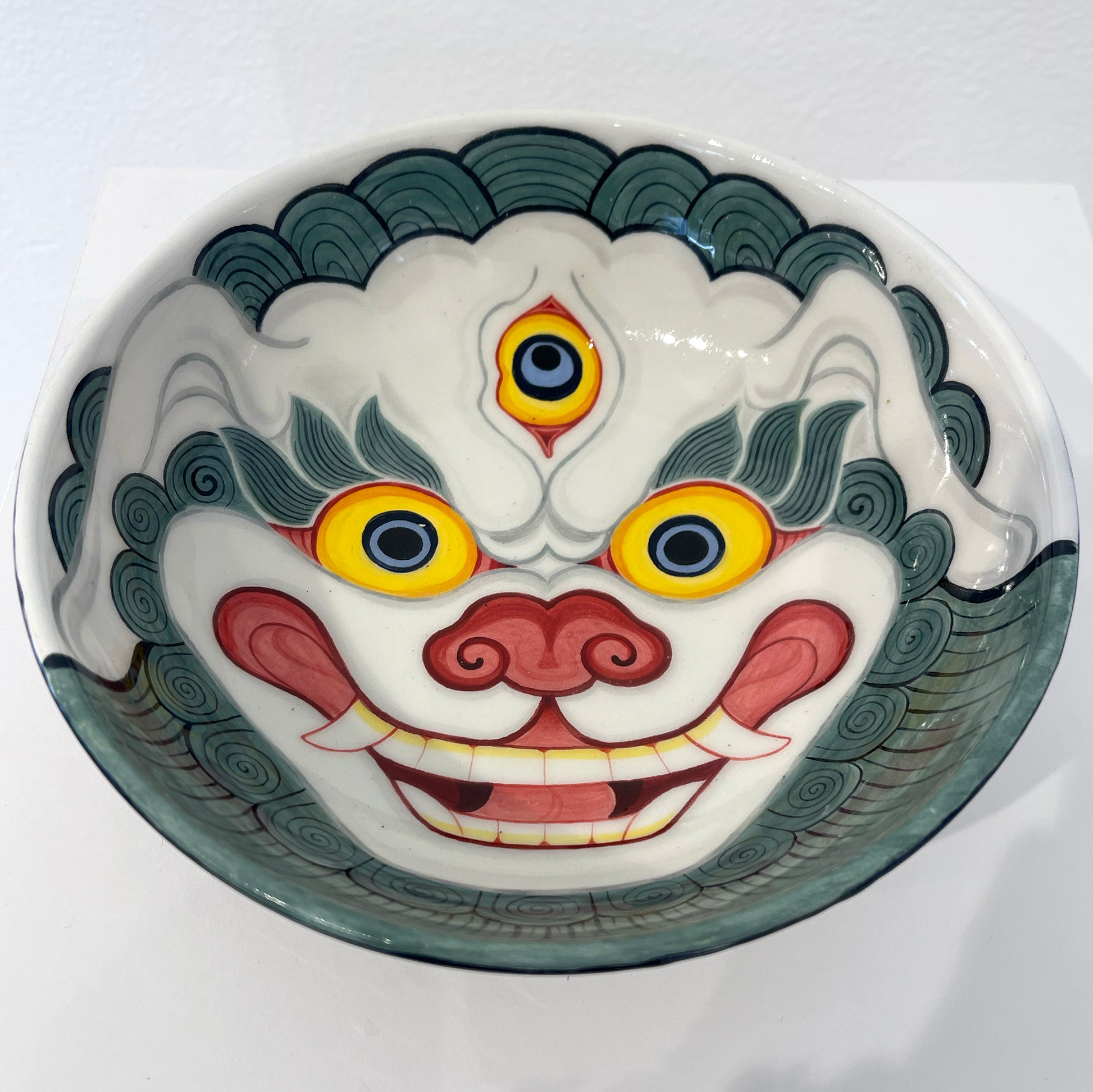 Flo Nuttall, whose ceramics are known by the alias Divineartpottery, is originally from the United Kingdom, but currently based in Rome, Italy, where she has lived for the past 10 years. Her ceramic work is inspired by years of tattooing and traveling through various parts of Asia, where she deepened her interest in eastern imagery; the subjects, the colour palettes, and the mythology. Her most recent work is mainly focused around Tibetan and Buddhist /Hindu imagery, where she enjoys blending together symbols and subjects as one might in tattooing, only this time with the medium of paint. She aims to make pieces that convey not just the beauty, but also the macabre and mystical nature of these fascinating symbolic representations.