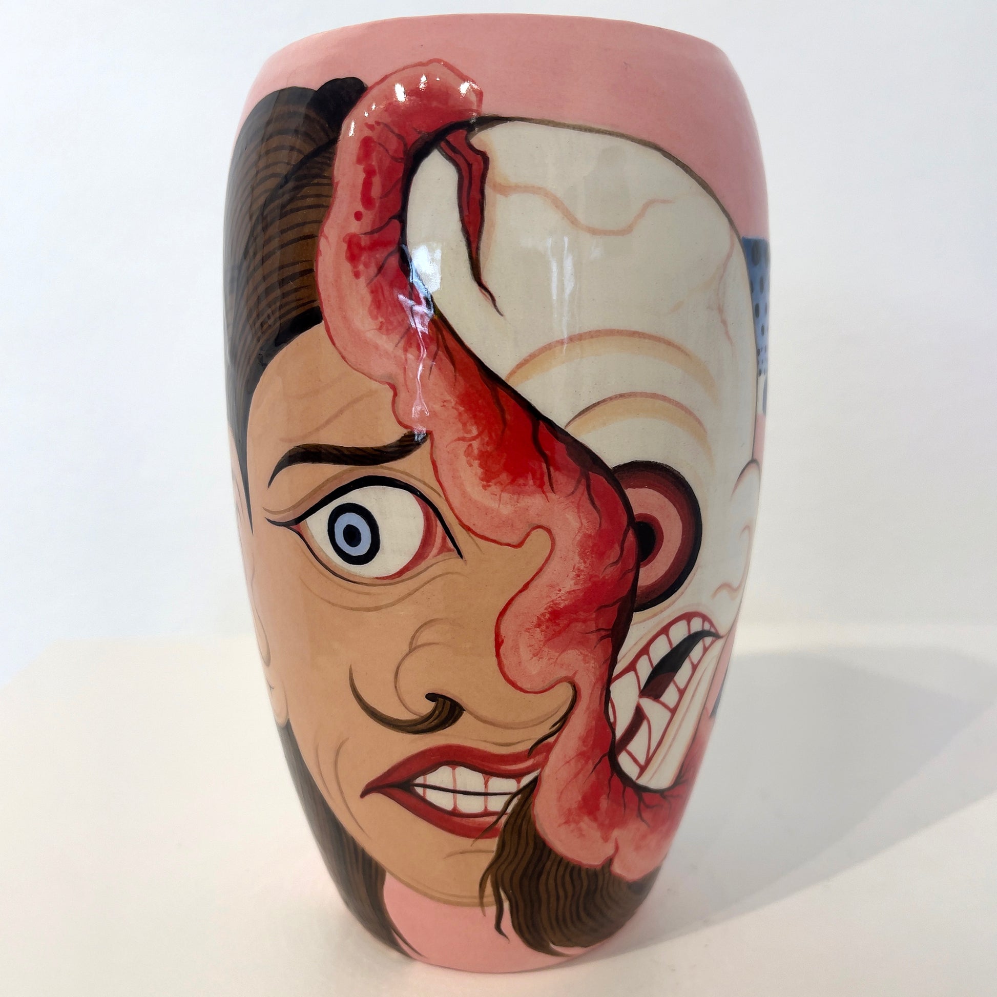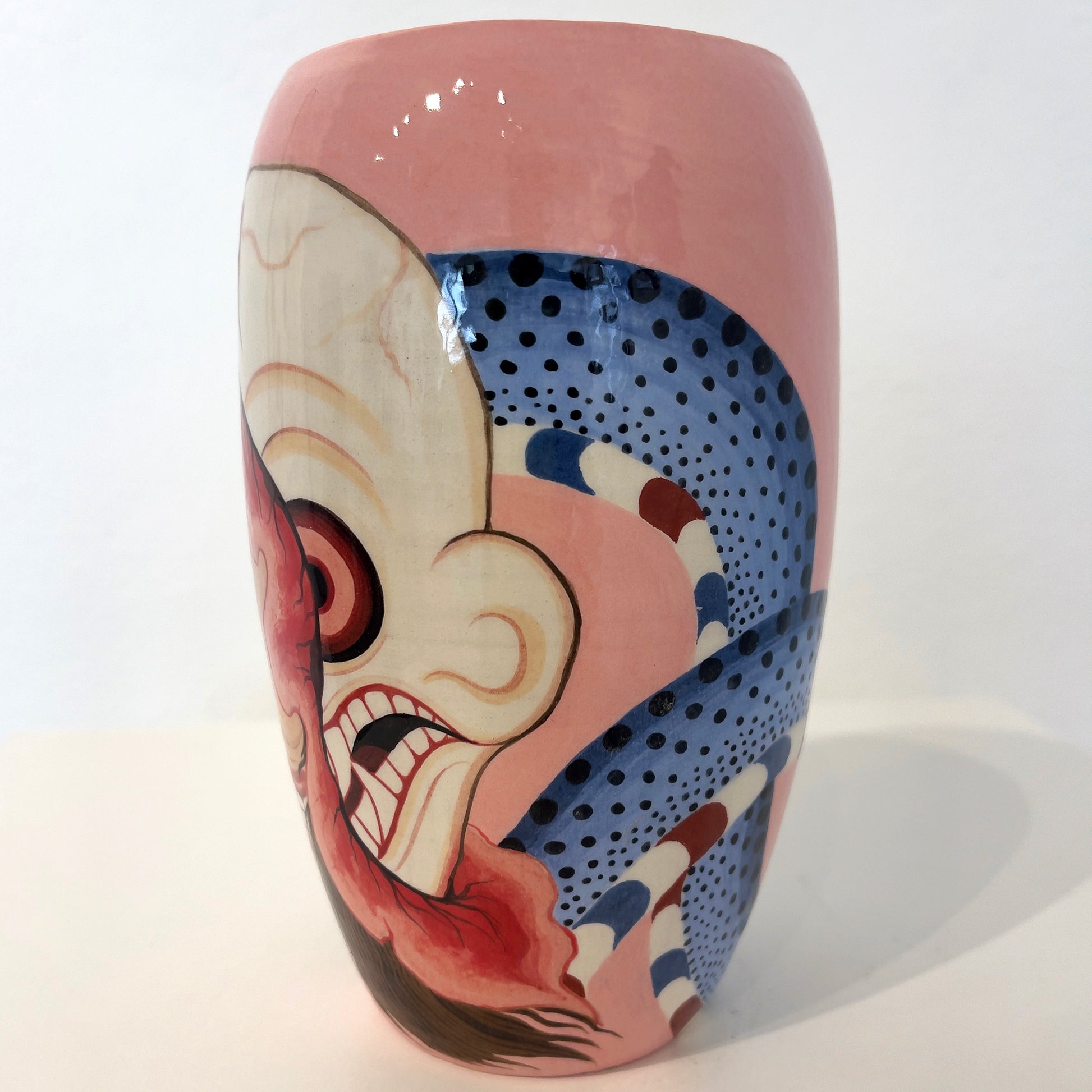 Flo Nuttall, whose ceramics are known by the alias Divineartpottery, is originally from the United Kingdom, but currently based in Rome, Italy, where she has lived for the past 10 years. Her ceramic work is inspired by years of tattooing and traveling through various parts of Asia, where she deepened her interest in eastern imagery; the subjects, the colour palettes, and the mythology. Her most recent work is mainly focused around Tibetan and Buddhist /Hindu imagery, where she enjoys blending together symbols and subjects as one might in tattooing, only this time with the medium of paint. She aims to make pieces that convey not just the beauty, but also the macabre and mystical nature of these fascinating symbolic representations.