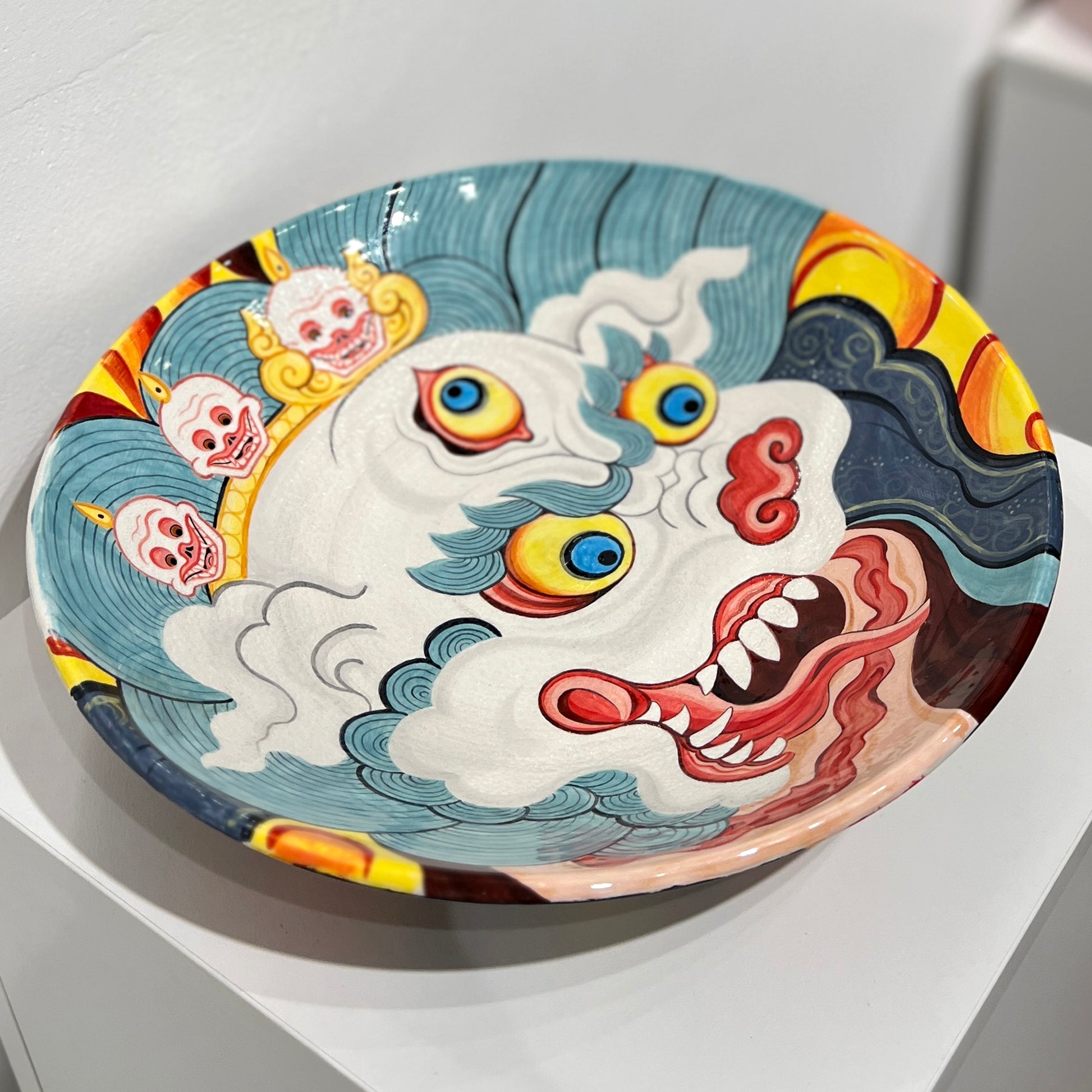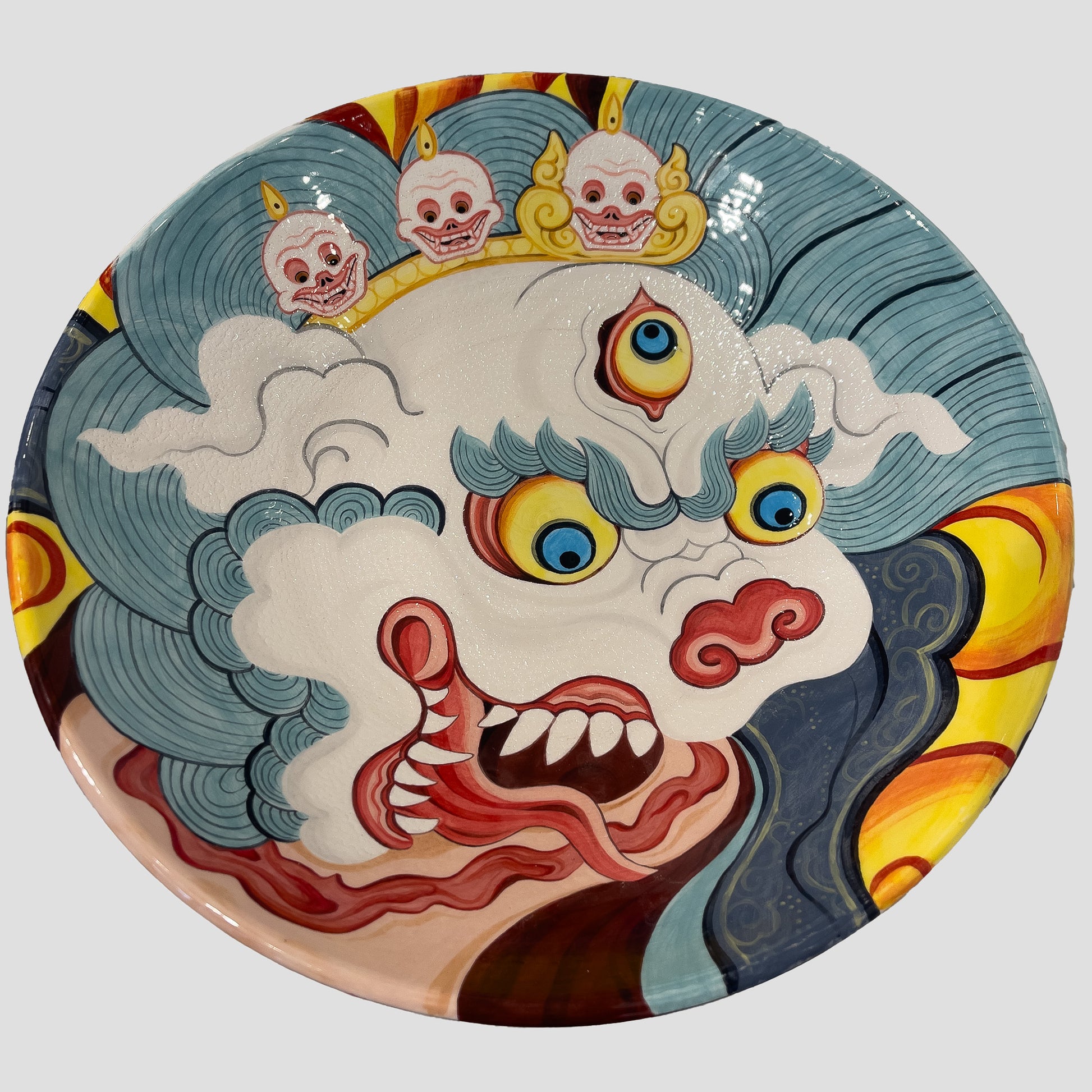 Flo Nuttall, whose ceramics are known by the alias Divineartpottery, is originally from the United Kingdom, but currently based in Rome, Italy, where she has lived for the past 10 years. Her ceramic work is inspired by years of tattooing and traveling through various parts of Asia, where she deepened her interest in eastern imagery; the subjects, the colour palettes, and the mythology. Her most recent work is mainly focused around Tibetan and Buddhist /Hindu imagery, where she enjoys blending together symbols and subjects as one might in tattooing, only this time with the medium of paint. She aims to make pieces that convey not just the beauty, but also the macabre and mystical nature of these fascinating symbolic representations.