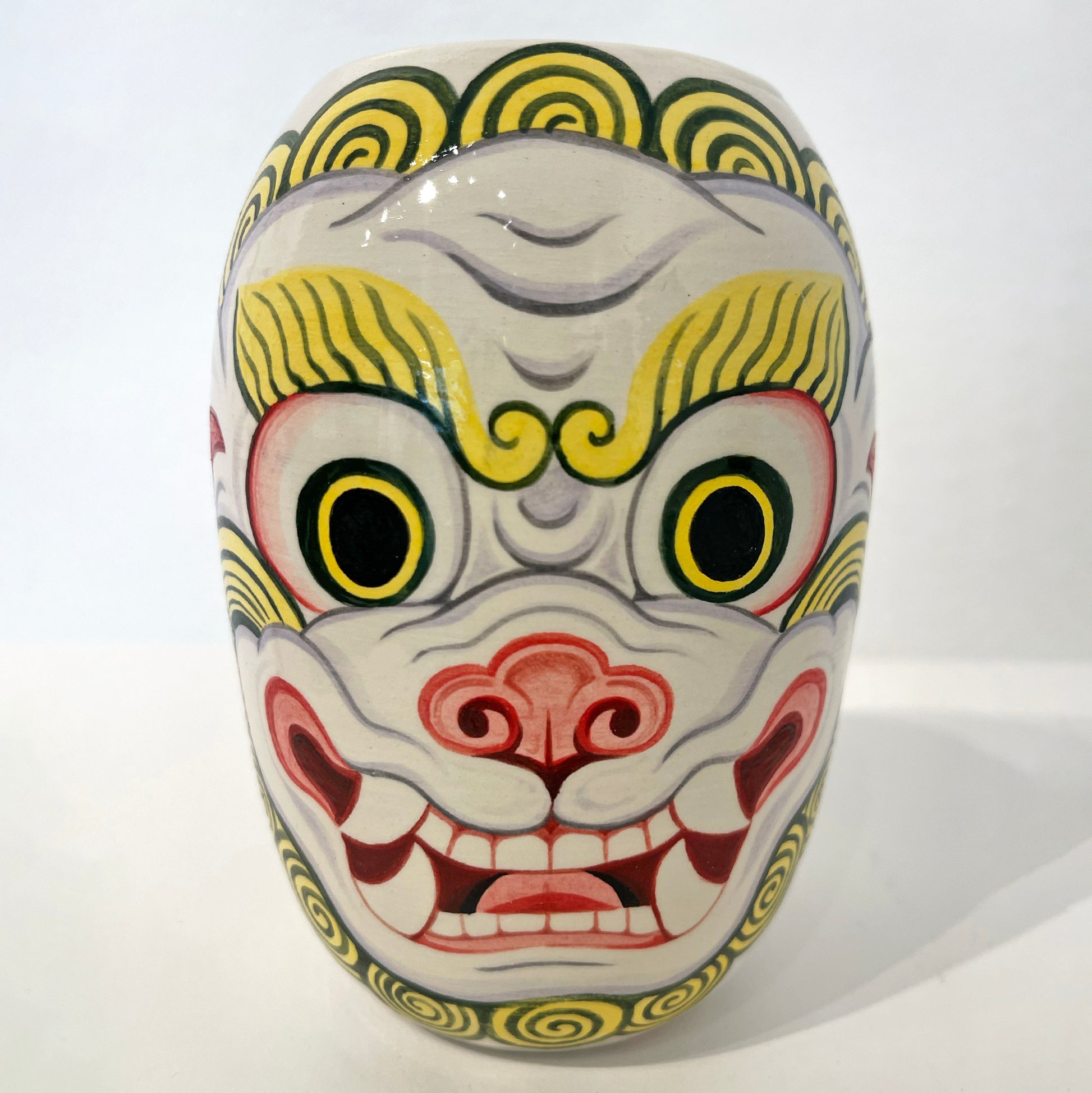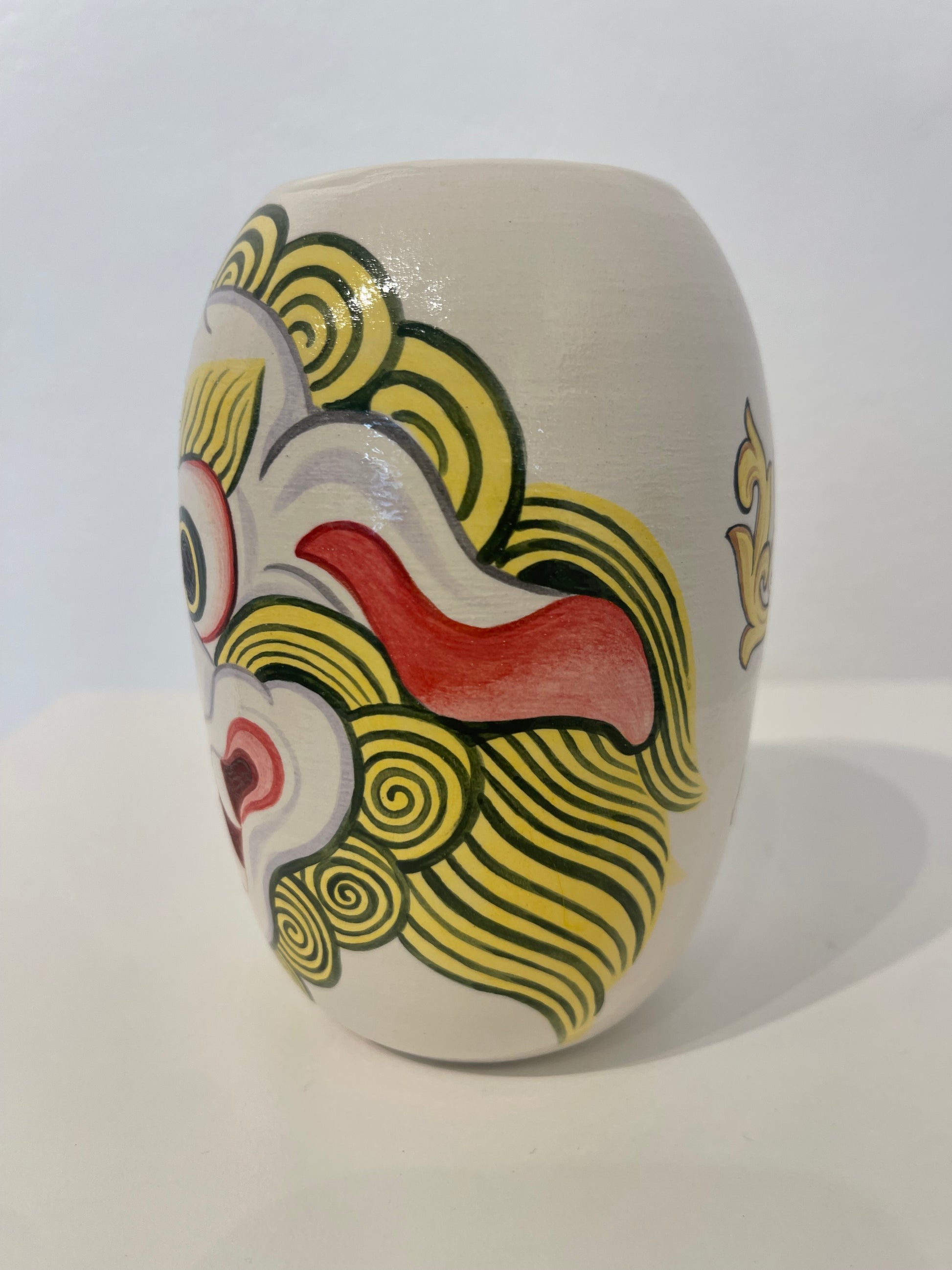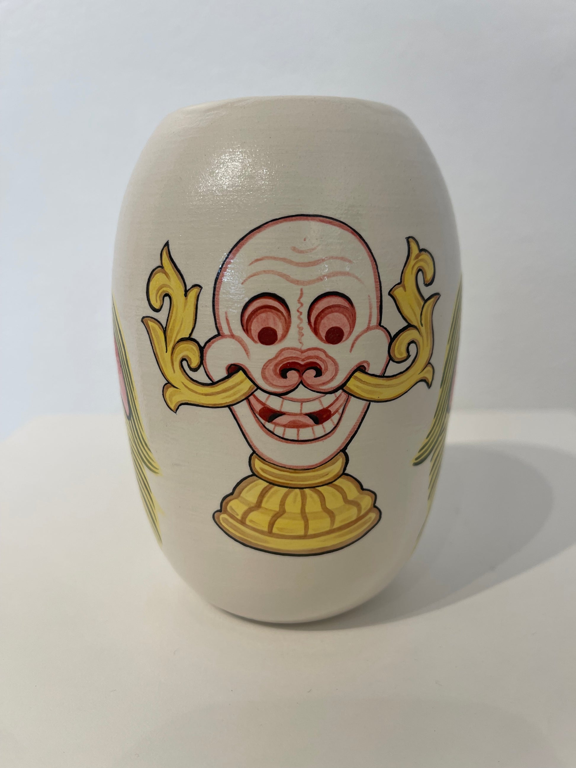 Flo Nuttall, whose ceramics are known by the alias Divineartpottery, is originally from the United Kingdom, but currently based in Rome, Italy, where she has lived for the past 10 years. Her ceramic work is inspired by years of tattooing and traveling through various parts of Asia, where she deepened her interest in eastern imagery; the subjects, the colour palettes, and the mythology. Her most recent work is mainly focused around Tibetan and Buddhist /Hindu imagery, where she enjoys blending together symbols and subjects as one might in tattooing, only this time with the medium of paint. She aims to make pieces that convey not just the beauty, but also the macabre and mystical nature of these fascinating symbolic representations.